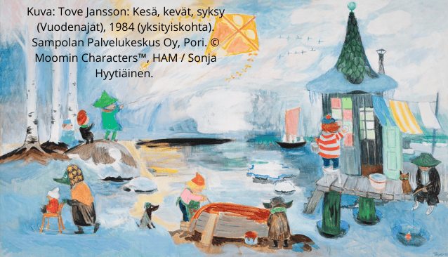 Näyttelyssä nähdään muun muassa Janssonin viimeinen julkinen taideteos Kevät, kesä, syksy, muumiaiheisia sekatekniikkatöitä sekä Pietilän grafiikkaa.