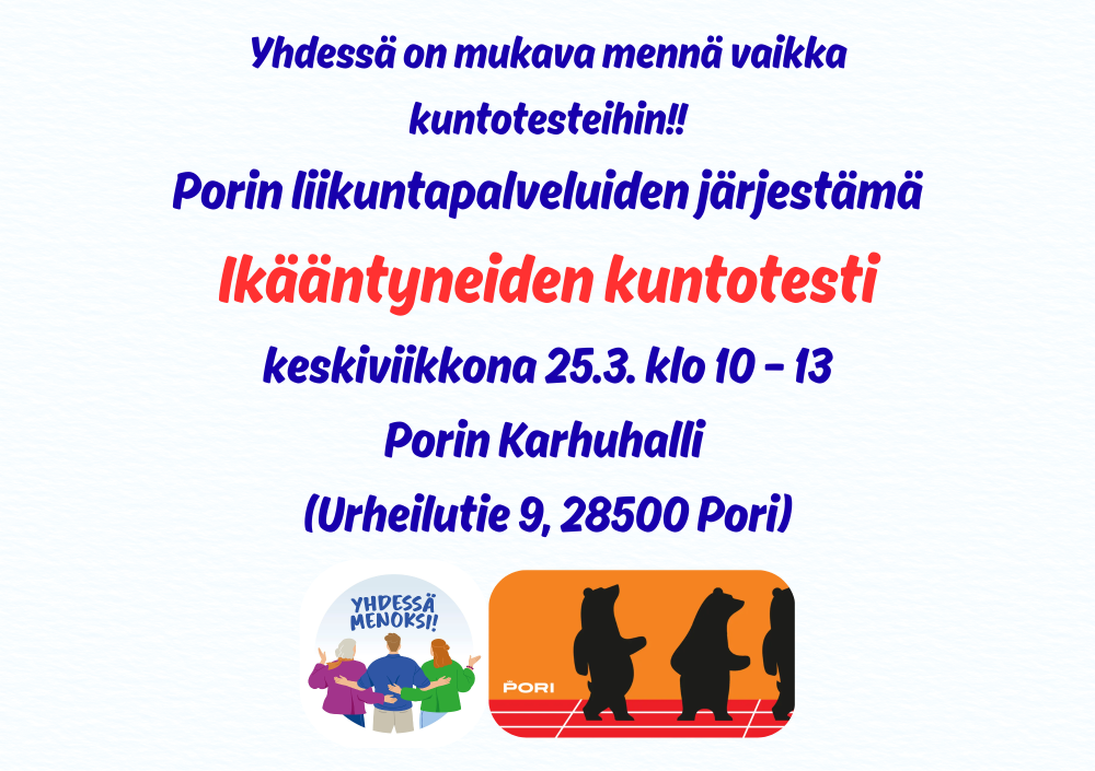 Tule Menoksi-kavereiden kanssa Porin Karhuhalliin (Urheilutie 9, 28500 Pori, esteetön kulku), jossa järjestetään ikääntyneiden kuntotestit (Porin kaupungin liikuntapalvelut). Testauspäivän aikana voit osallistua yhden kilometrin kävelytestiin ja erilaisiin toimintakyvyn testeihin. Karhuhallissa on paikalla eri toimijoita antamassa tietoa hyvästä ravitsemuksesta, vinkkejä liikkumisesta sekä motivaatiota oman hyvinvoinnin ylläpitämiseen.