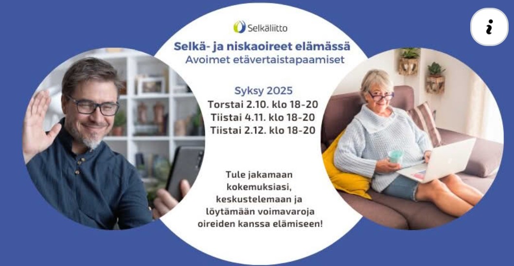 Tervetuloa kaikille avoimiin etävertaistapaamisiin keskustelemaan muiden selkä- ja niskaoireisten kanssa ja löytämään voimavaroja oireiden kanssa elämiseen.